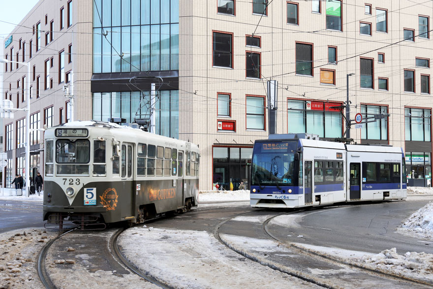 〔 函館市電 函館駅前交差点で離合する! 710形 723 湯の川 行き ・ 9600形 9603 函館どっく前 行き 〕