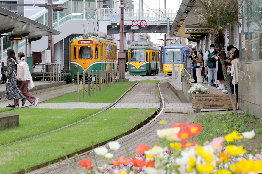 〔 鹿児島中央駅前 電停 2面2線の相対式ホームで電車接近表示機とアナウンスが電車の接近を伝えています! 〕