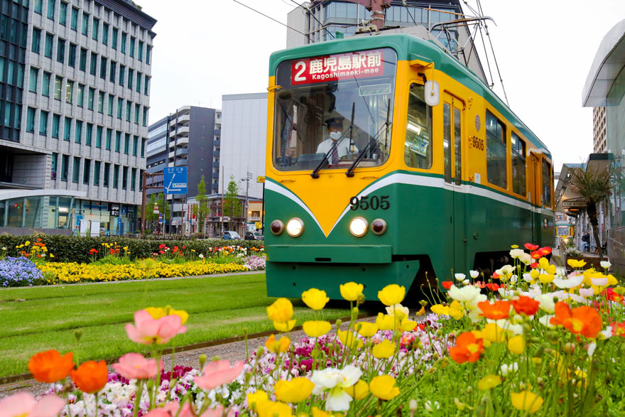 〔 鹿児島市電 鹿児島中央駅前 電停を発車する! 9500形 9505 鹿児島駅前行き R. 5. 4. 5 撮影 〕