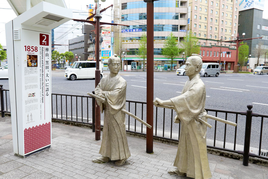 〔 鹿児島市電 高見馬場交差点 日本の将来について語り合っている樺山資紀と黒田清隆の銅像! R. 5. 4. 5 撮影 〕