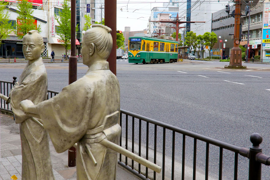 〔 鹿児島市電 銅像後方の高見馬場交差点を渡る! 9500形 9504 谷山行き R. 5. 4. 5 撮影 〕