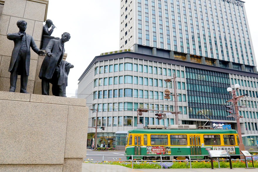 〔 鹿児島市電 ” 英国留学生の像 ” が見守る中を往く! 2110形 2113号車 R. 5. 4. 5 撮影 〕