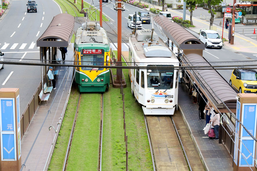 〔 鹿児島市電 郡元電停 終点に到着の2系統 9500形 9505 ・1系統 9700形 9702 谷山行き R. 5. 4. 5 撮影 〕