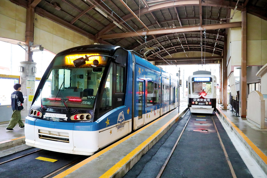 〔 鹿児島市電 谷山 電停 2線のホームに入れ替わり入駅する! 7000形 7004・9500形 9507 R. 5. 4. 6 撮影 〕