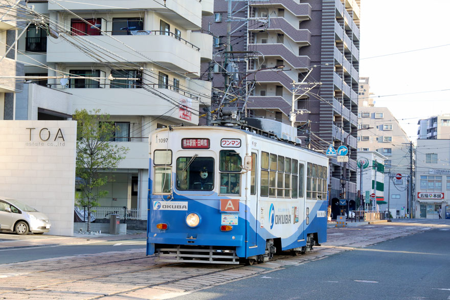 〔 熊本市電 呉服町停留場 1090形 1097 熊本駅前・田崎橋行き R.4. 11. 27 撮影 〕