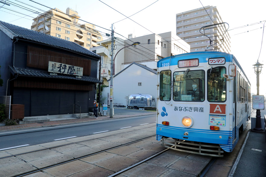 〔 熊本市電 呉服町停留場 熊本駅前方面停留場に到着する! 1200形 1210 R.4. 11. 27 撮影 〕