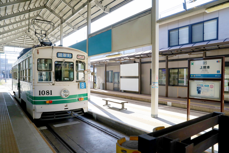 〔 熊本市電 上熊本停留場 頭端式ホーム3面2線を有する。 1080形 1081 健軍町行き R.4. 11. 27 撮影 〕