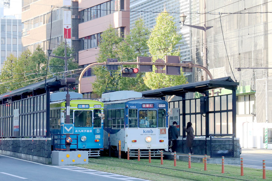〔 熊本市電 熊本城・市役所前停留場 1350形 1354 上熊本行き ・ 1353 健軍町行き R.4. 11. 27 撮影 〕