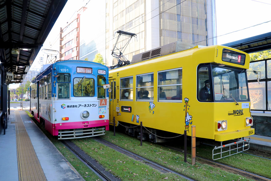 〔 熊本市電 熊本城・市役所前停留場 1090形 1091 田崎橋行き・ 8500形 8504 健軍町行き R.4. 11. 27 撮影 〕