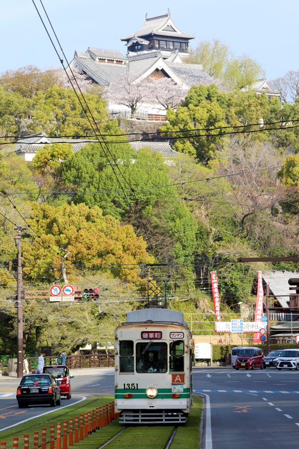 〔熊本市電 熊本城・市役所前~通町筋 熊本城をバックに走る! 1350形 1351〕