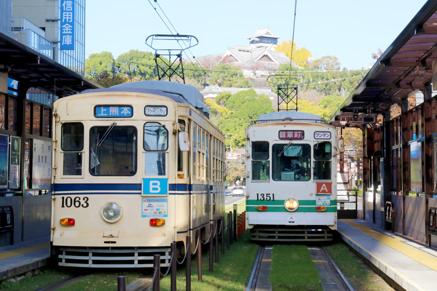 〔 熊本市電 通町筋停留場 後方には熊本城天守閣! 1060形 1063・1350形 1351 R.4. 11. 27 撮影 〕