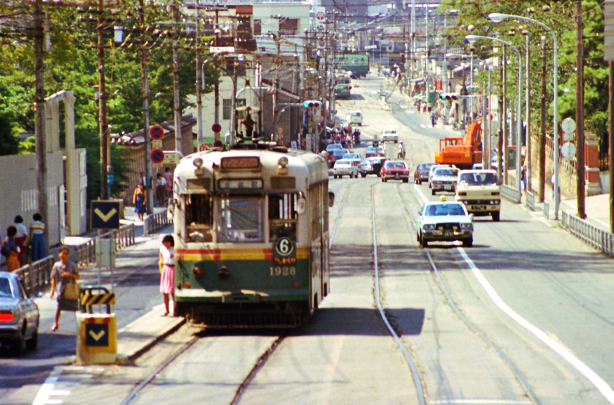 〔 京都市電 東山七条にて 後方に京阪電車が踏切を通過する姿が見える! ” 1900形 1928 ” ”S.53.7 撮影 〕