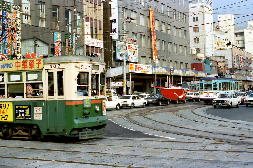 〔 長崎電軌 西浜町電停付近にて 石橋行き ” 300形 307 ”・蛍茶屋行き ” デミュート号 370形 372 ” S.54.9.6 撮影 〕