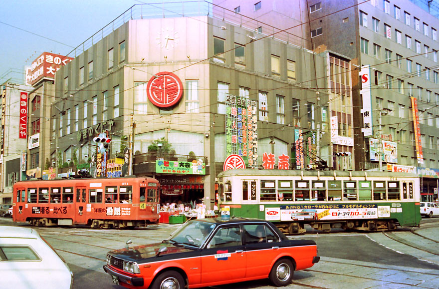 〔 長崎電軌 西浜町電停付近にて 正覚寺行き ” 370形 371 ”・蛍茶屋行き ” 211形 214 ” S.54.9.6 撮影 〕