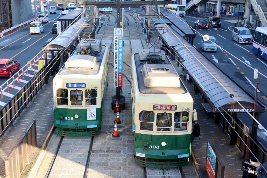 〔 長崎駅前電停 300形 308 赤迫行き行き ・ 300形 303 蛍茶屋行き R.4. 11. 25 撮影 〕