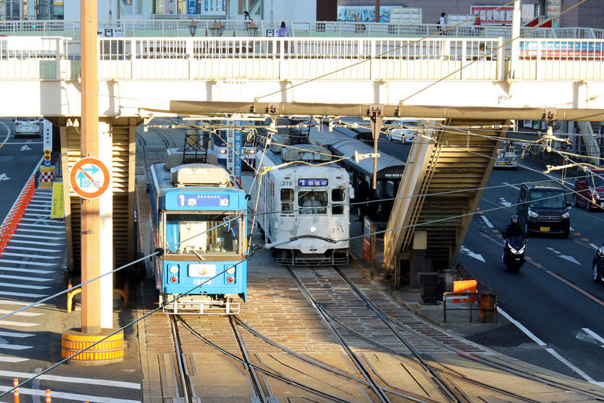 〔 長崎駅前電停 この電停を出ると新地中華街・崇福寺 方面 と市役所・蛍茶屋 方面への線路が別れます! 〕