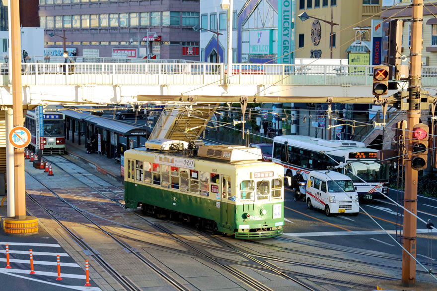 〔 長崎電軌 長崎駅前~桜町 長崎駅前停留場を左折し蛍茶屋に向かう! 300形 305 R.4. 11. 25 撮影 〕