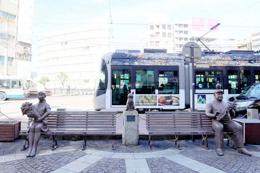 〔 長崎電軌 新地中華街~西浜町 西浜町電停・三角広場に市民がベンチに腰掛けながら彫刻を鑑賞できる場所が!〕