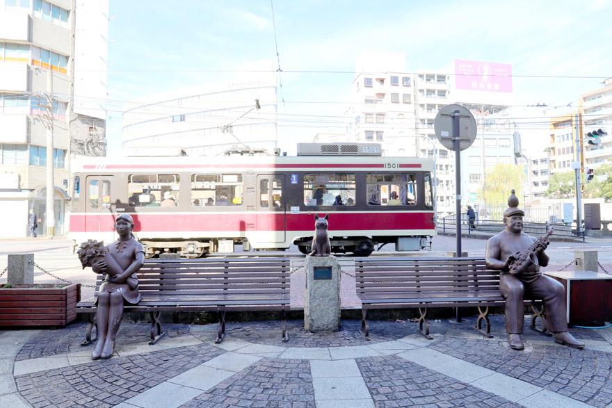 〔 作品名は「安息の日」 花束を抱えた少女像、アルトサクソフォンを持った男性像が座りベンチ間に猫の像を配している!〕