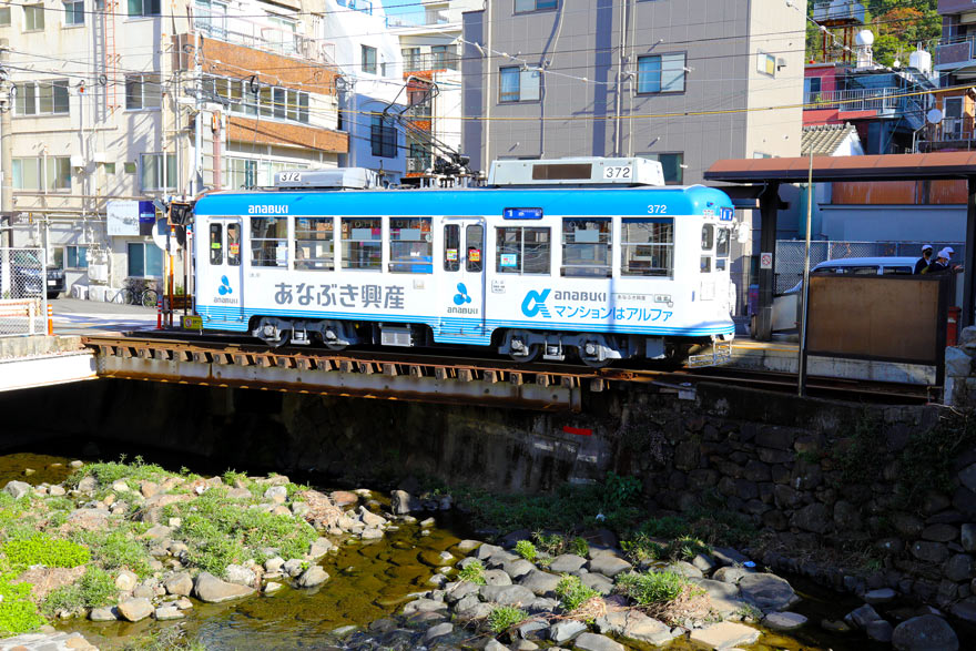〔 長崎電軌 崇福寺停留場 ホームとその下を流れる玉帯川の上に停留場があるという特異な構造! 370形 372 〕