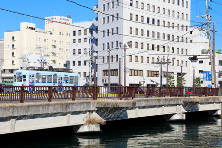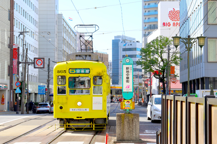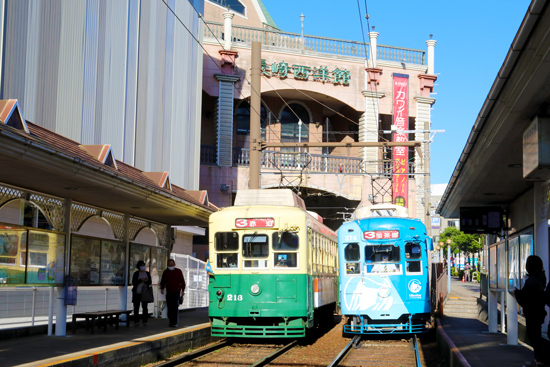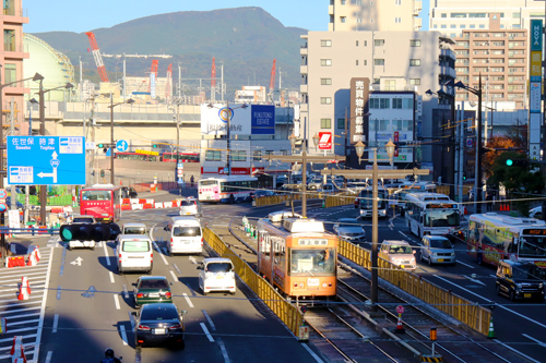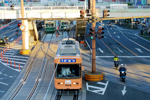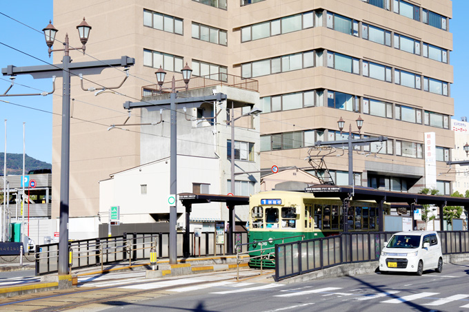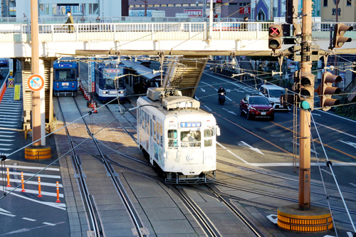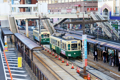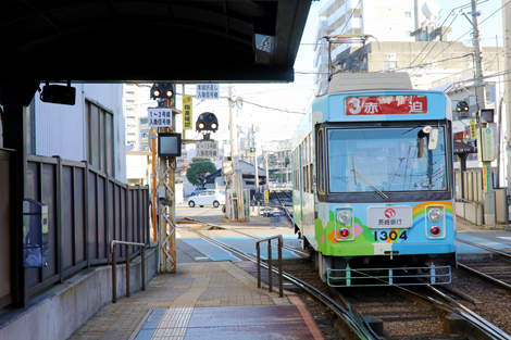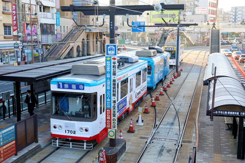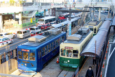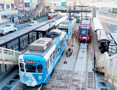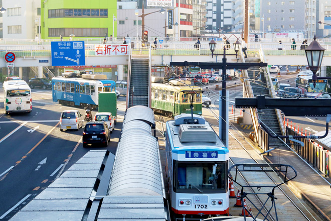 石橋を結ぶ5号系統との乗り換え停留場で、