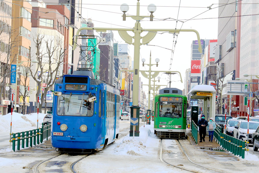 〔 札幌市電 資生館小学校前 停留場でご対面! 内回り 220形 222 ・ 外回り 3300形 3305 R. 7. 2. 12 撮影 〕