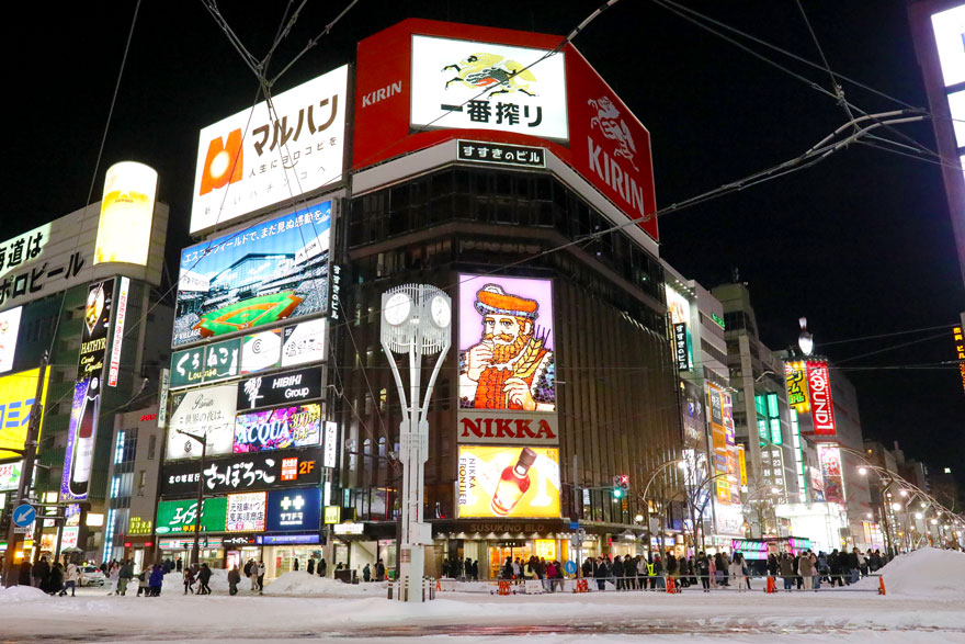 〔 すすきの交差点 大勢の観光客で賑わう人気の定番スポット! 札幌すすきのビル「ニッカウヰスキー看板」 〕