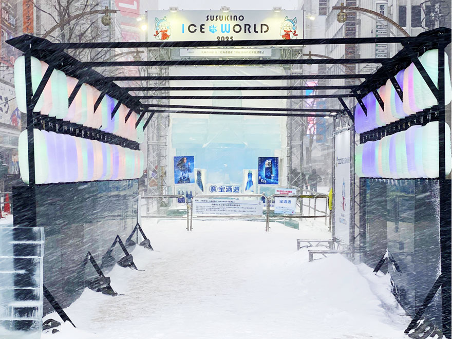 〔「すすきのアイスワールド2025」 歓迎塔とメイン氷像 ” 開拓使時代の洋風建設時計台 ” R. 7. 2. 11 撮影 〕