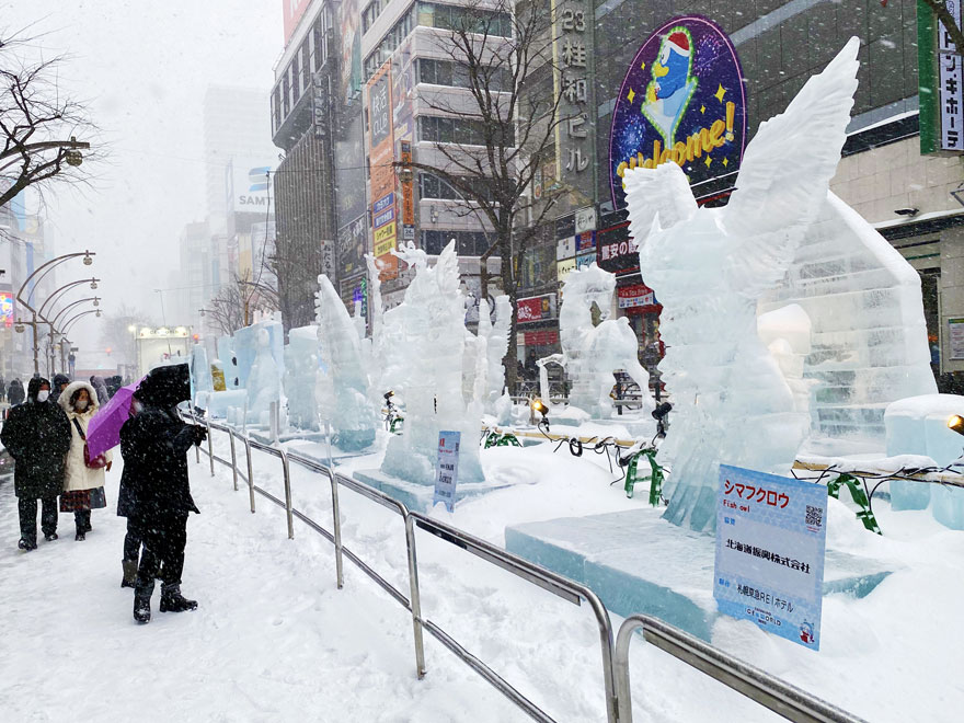 〔「すすきのアイスワールド2025」”すすきの” の街中に氷像等60基が展示、雪が降りしきる中でも大勢の見物客が! 〕
