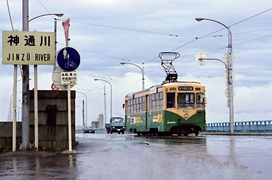 〔 富山地鉄 市内線 富山大橋にて 神通川を渡る ” デ7000形 7019 ” S.50.10 撮影 〕