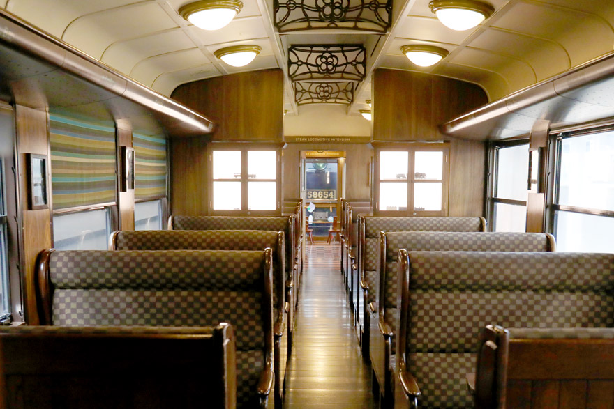 〔 SL人吉 3号車 真ん中の仕切りを挟んで両側共に茶色の布のボックスシートが配置。 R.5. 8. 21 撮影 〕