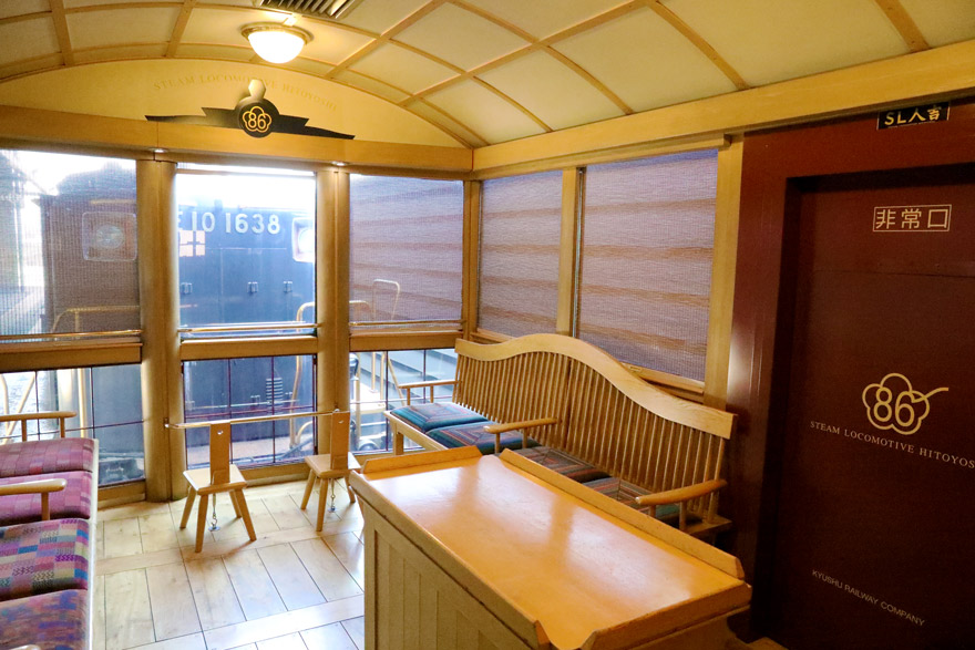 〔「SL人吉」 1号車 展望ラウンジ ここにも3号車と同じく非常口があるが ” 赤色 ” ! R.5. 8. 21 撮影 〕
