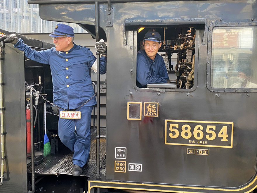 〔「SL人吉」 SL操縦の重責から解放され、安堵の笑顔が清々しいですね! R.5. 8. 21 撮影 〕