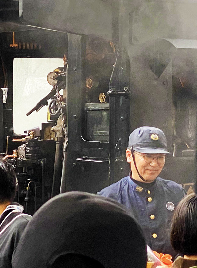 〔「SL人吉 ラストラン」 運行終了式典で一般客から花束を受ける笑顔の機関士! 〕