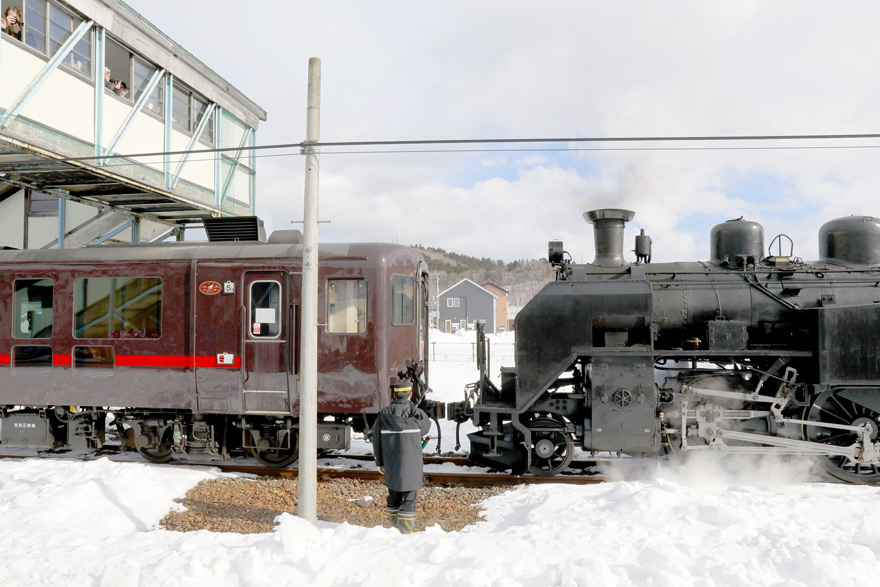 〔 標茶駅 「SL冬の湿原号」 機関車は係員の指示により、2番のりばに停車している客車へ連結のため徐々に進行! 〕