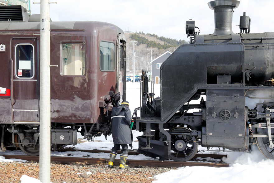 〔 標茶駅 「SL冬の湿原号」 係員は、機関車と2番のりばに停車している客車との連結を確認! R.7. 2. 14撮影 〕