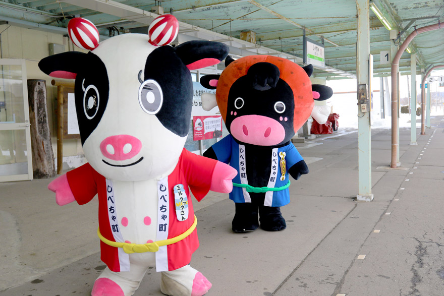 〔「SL冬の湿原号」 標茶駅 ホームから、ご当地キャラクター「ミルクック」、「ハッピーくろべぇ」もお見送り! 〕