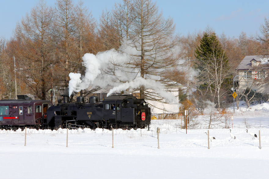 〔「SL冬の湿原号」 茅沼駅 ” タンチョウ ” が見守る中なか発車する! 釧路行き R. 7. 2. 15 撮影 〕