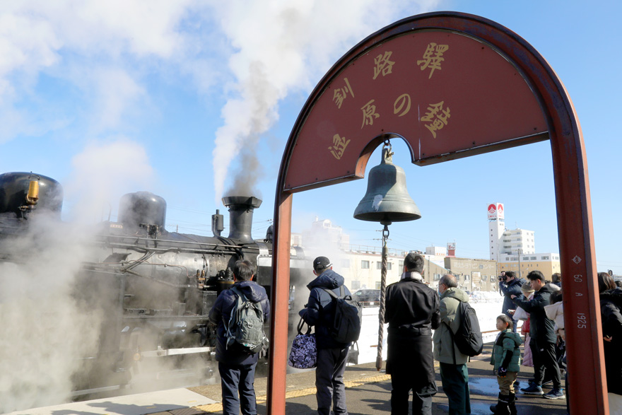 〔 釧路駅 ホームに設置の ” 湿原の鐘 ” を鳴らし「SL冬の湿原号」の旅立ちを盛り上げます!   R. 7. 2. 14 撮影 〕
