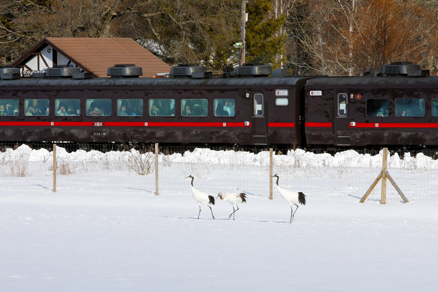 〔「SL冬の湿原号」茅沼駅 飛び立った三羽の ” タンチョウ ” が合流し、釧路行きのお見送り? R.7. 2. 15撮影 〕