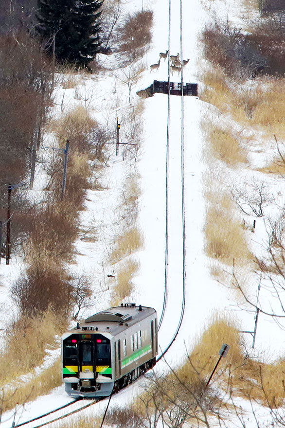 〔 H100形 網走行き 前方に ”エゾシカ ” の大群が! 大丈夫かな? 〕