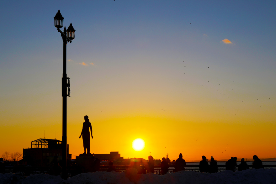 〔 幣舞橋(ぬさまいばし) 「春の像」「港町かもめホール」を背景に幻想的に夕陽が徐々に沈んでいきます! 〕