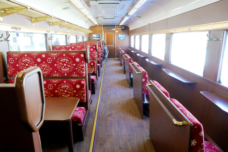 〔「SL冬の湿原号」 ” 1号車・5号車 ” 「たんちょうカー」 川側にカウンター席、山側に高床ボックス席を配置! 〕