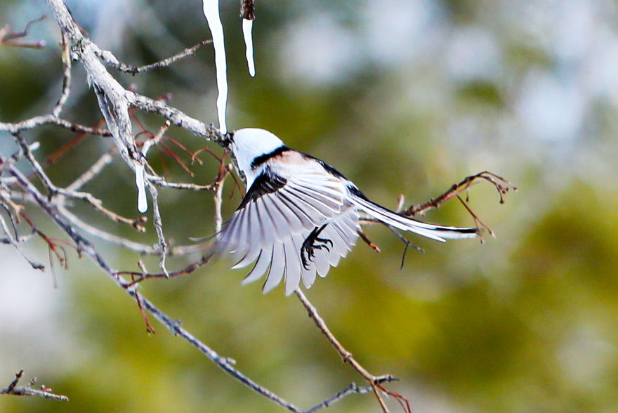 〔「シマエナガ」 氷柱をホバリングして舐めている姿を写真に収められるのは滅多になく ” まさに奇跡の一枚!” 〕