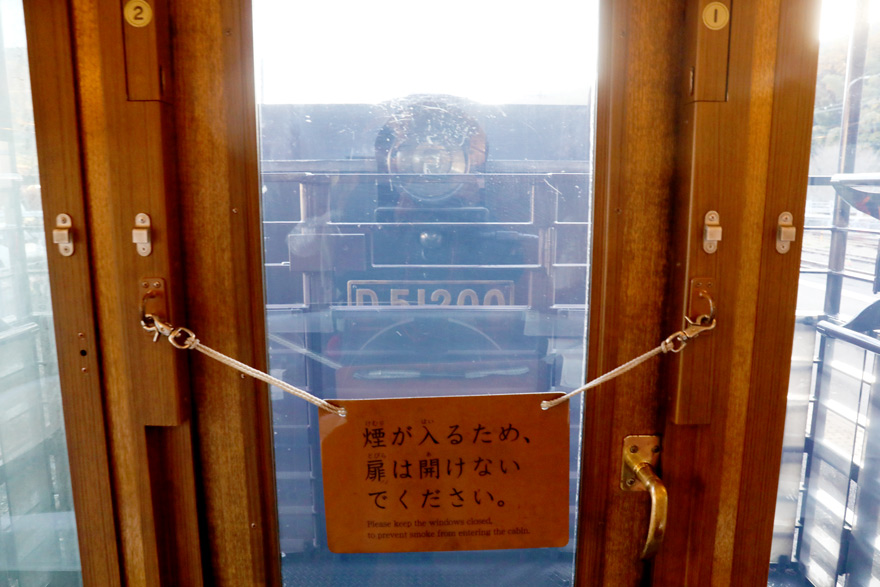〔「SLやまぐち号」1号車(グリーン車) 開放式展望デッキは新山口行きでは機関車が先頭なので開閉できない!〕