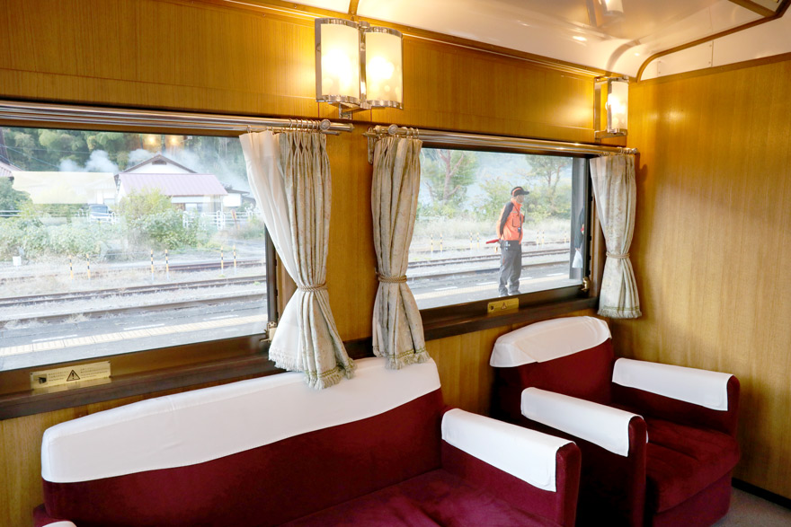 〔「SLやまぐち号」1号車(グリーン車)オロテ35 マイテ49形を参考として新製された展望車で応接間風の座席! 〕