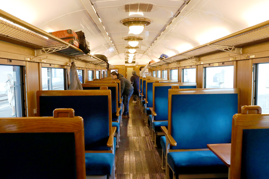 〔「SLやまぐち号」 2号車(スハ35) 普通車で、左右両側に4名用のボックスシートが並んでいる! 〕