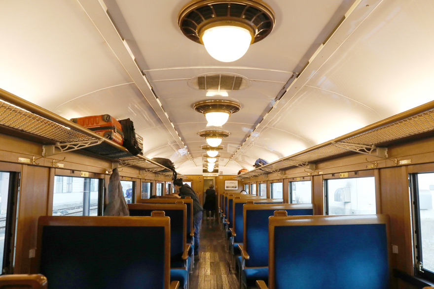 〔「SLやまぐち号」2号車(スハ35) 落ち着きのある紺色と垂直の背もたれの座席が懐かしさとモダンさを感じる! 〕