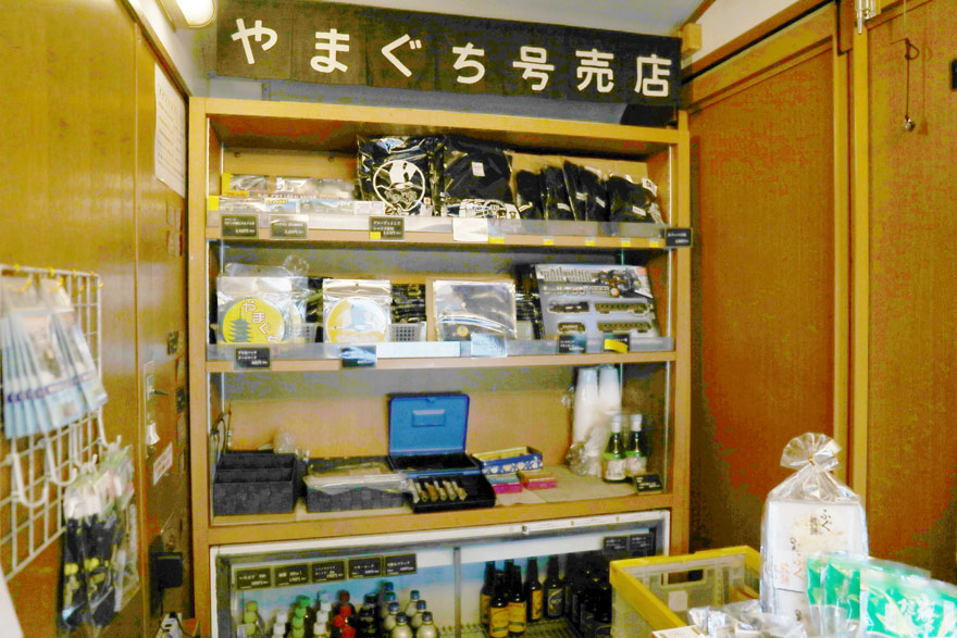 〔 3号車(ナハ35) 販売カウンターでは、ご当地ラスクや山口地ビールなどの地元特産品やお土産が販売されている! 〕