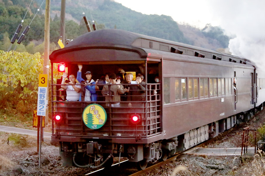 〔 篠目駅 細野第2踏切を通過する「SLやまぐち号」新山口行き! 大勢の撮り鉄?に展望デッキからもお手ふり! 〕